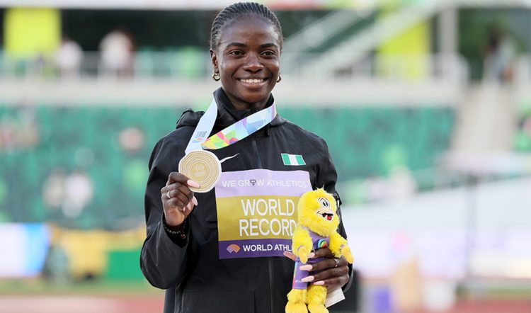The action during the final session at the World Championships in Eugene was barely underway when Tobi Amusan destroyed the 100m hurdles world record with 12.12 (0.9) to slice 0.08 from Keni Harrision’s previous mark. Amazingly it was her first time inside 12.40 – and she was wearing distance running spikes too! “I believe in my abilities but I was not expecting a world record at these championships,” the Nigerian said before going on to win the final in a wind-assisted 12.06.